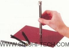 便携式 318 硬度试验棒使用特别简单。通过滑杆可设置估计或已知弹簧压力。将仪器垂直放在测试表面,以 10 mm / sec 的速度划一根 5~10 mm 的直线。测试头会产生一条肉眼仅看得见的划痕。如果弹簧压力太高,划痕会很清晰,如果弹簧压力太低,将没有划痕出现。通过锁定滑杆每次可以控制所需的压力,单位为牛顿。